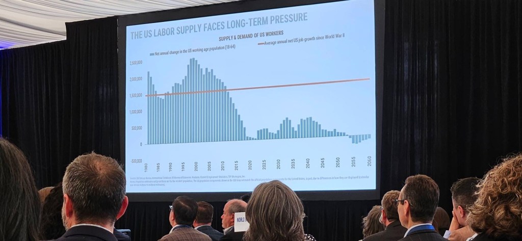 Another portion of his presentation that may have been misunderstood by some in attendance involved a few of his slides, particularly those addressing labor trends. One slide focused on labor shortages over the past several decades and projected into the future. He made a point to clarify that this is not a political argument, but a factual demographic and economic reality: there is more work to be done, but fewer people available to do it. He also emphasized that simply increasing population alone cannot fully solve that gap.